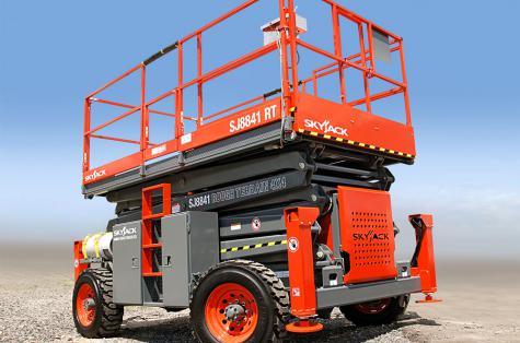 Offering a huge platform area and heavy duty capacity all in one package, the SJ8841 RT scissor lift rental utilizes Skyjack’s robust and reliable design features for meeting the demands of the most challenging jobsite environments. A fuel efficient GM 1.6L Vortec dual fuel engine powers Skyjack’s robust axle based 4WD system resulting in 30% gradeability.